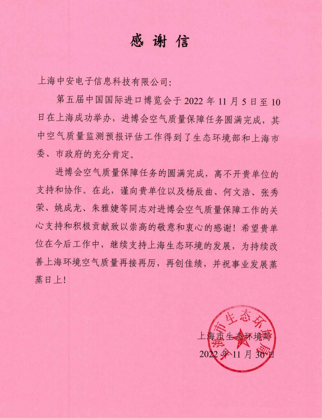 上海環(huán)監(jiān)中心就中安科技在21年國際進(jìn)博會空氣質(zhì)量監(jiān)測預(yù)報工作中杰出貢獻(xiàn)送來感謝信?。?021/12/31)